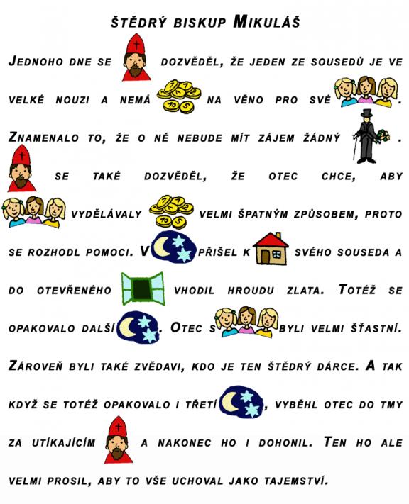 Svatý Mikuláš má svátek v neděli 6. prosince. Některé z vás ale možná navštíví už v sobotu večer ve vašich domovech. Zazpíváte mu písničku, možná povíte básničku a svatý Mikuláš vás jistě odmění nějakou drobností.